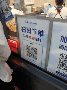Le process de Luckin Coffee s’appuie sur cet écosystème et voudrait que le client commande via son téléphone, en scannant le QR code de l‘établissement (voir photo ci-dessous), choisissant le type de café, les arômes éventuels etc. et récupère in fine sa commande auprès du personnel au contact avec lequel un échange minimal suffira amplement. Lorsque l’accès à la commande via le téléphone (français) est bloqué, tout le système s’effondre et le personnel doit intervenir (dans ce cas de figure, l’employée finira par utiliser son propre téléphone et se fera rembourser grâce au paiement en P2P !).